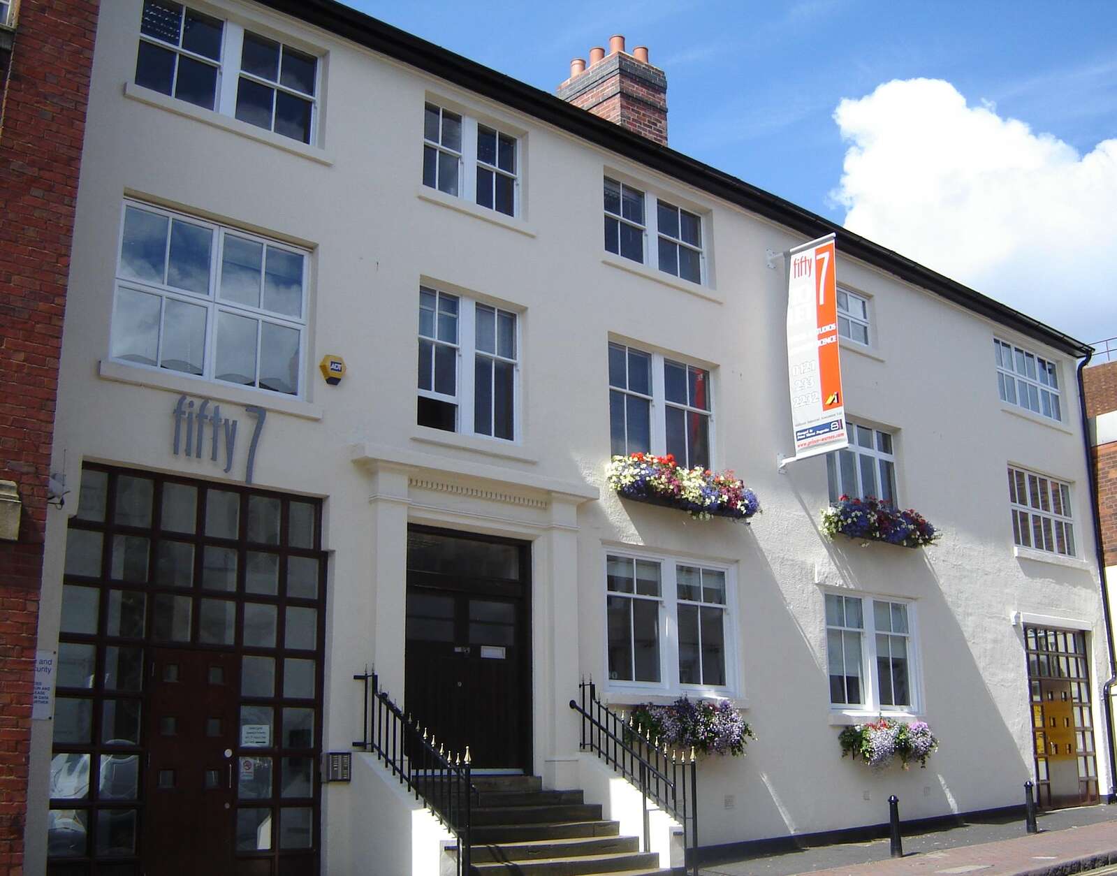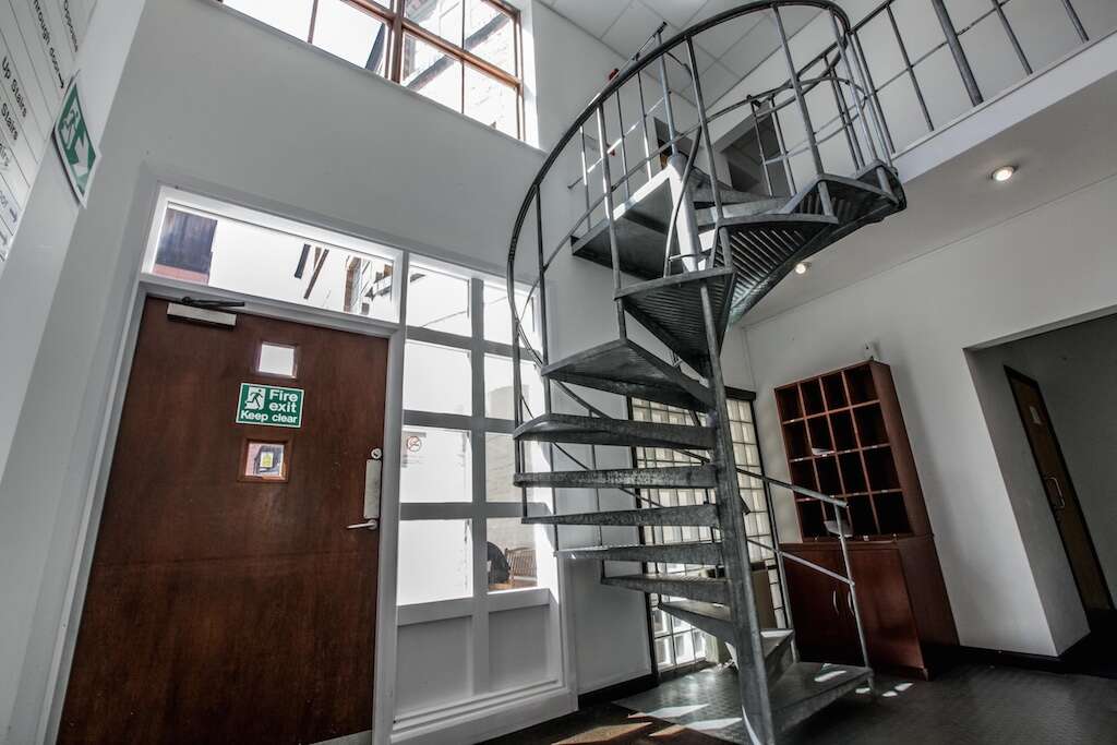 A rendered white facade, original sash and metal windows, floral window boxes, and a steel spiral staircase give the building a character that is difficult to replicate in modern commercial developments. Three separate entrance points serve different parts of the building, giving each occupier a distinct sense of address within a well-maintained landlord-managed environment.