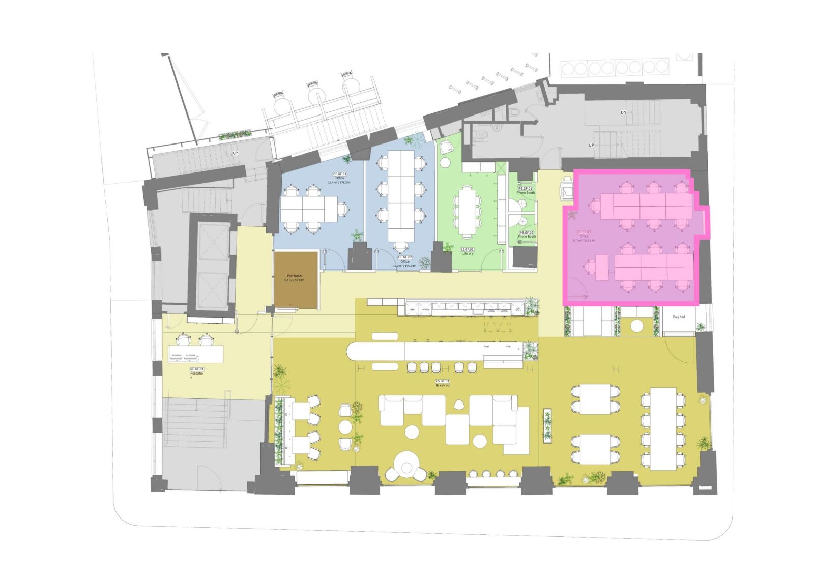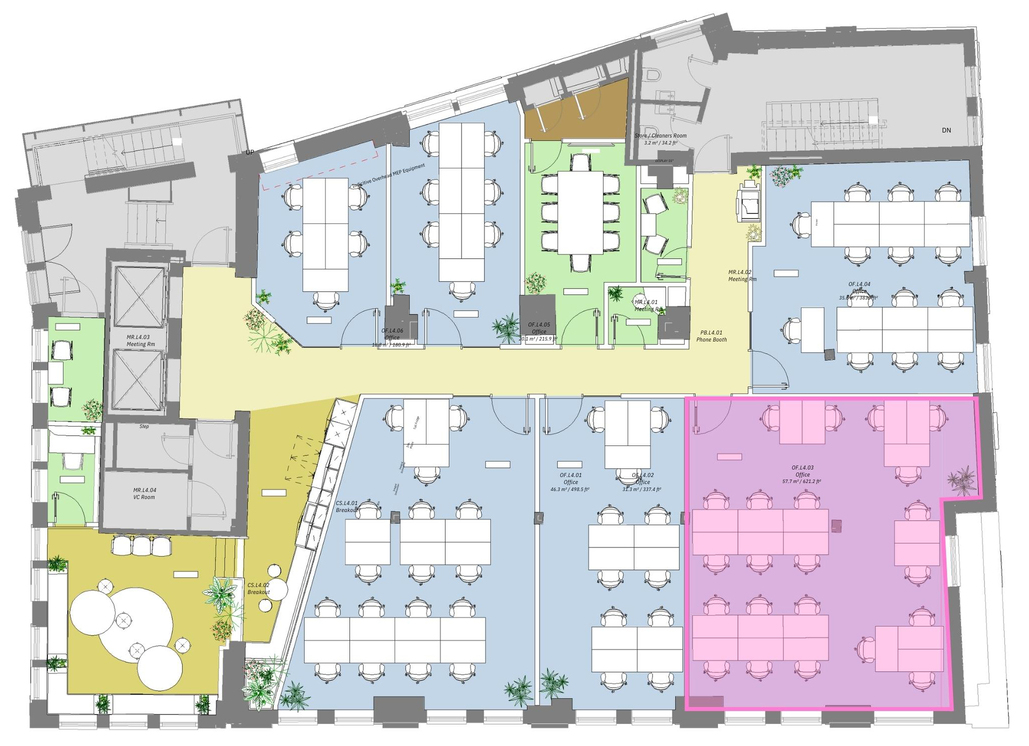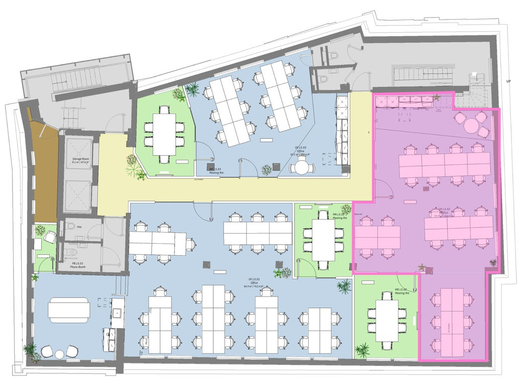Members enjoy free access to 20 high-specification meeting rooms, ranging from intimate two-person booths for focused catch-ups to fully AV-equipped 12-person suites for client presentations and workshops. Multiple phone booths are available throughout the building for private calls, and the secluded members courtyard provides a tranquil outdoor space tucked away from the city for relaxed informal collaboration and fresh air.
